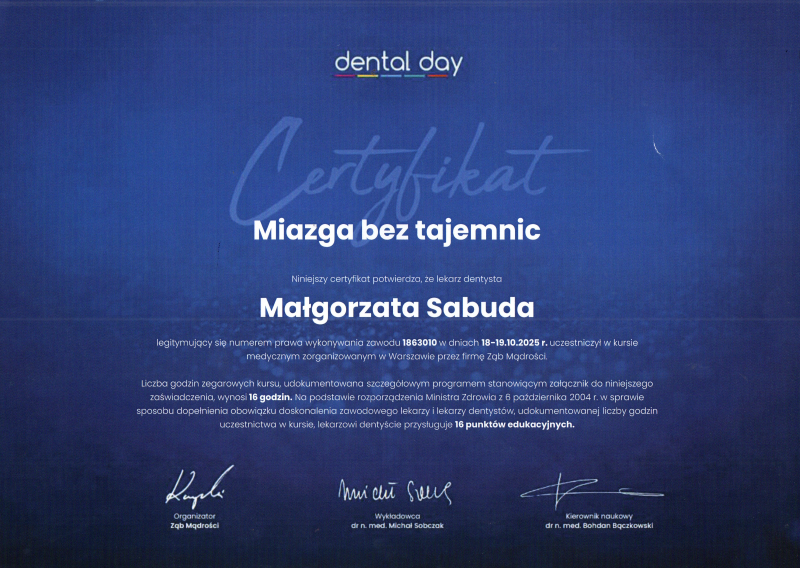Uczestniczka licznych kursów i konferencji m. in. poświęconych Stomatologii Dziecięcej i współczesnych metodą eliminacji stresu u małych pacjentów.