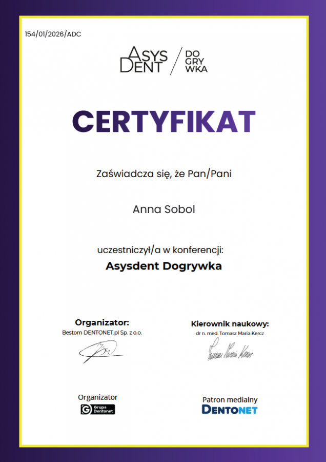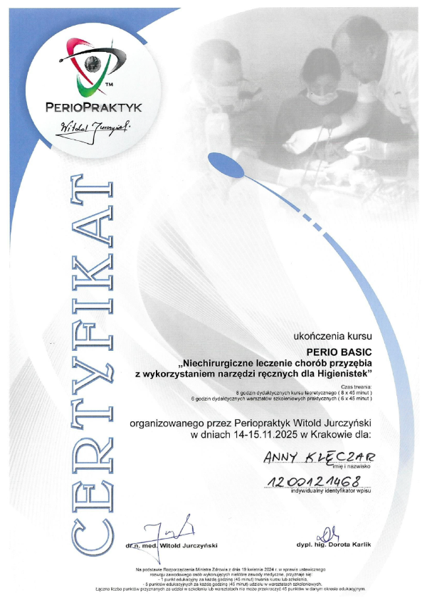 Dyplom higienistki stomatologicznej odebrała w 2015 roku. Od tego czasu uczestniczy w licznych kursach podnoszących kwalifikacje. Czynnie bierze udział w leczeniu ortodontycznym oraz asystuje w zabiegach stomatologii zachowawczej. Wykonuje swój zawód sumiennie i z wielkim zaangażowaniem. Z pasją przywraca pacjentom piękny i zdrowy uśmiech poprzez zabiegi profilaktyczne i higienizacyjne a także wybielanie zębów.